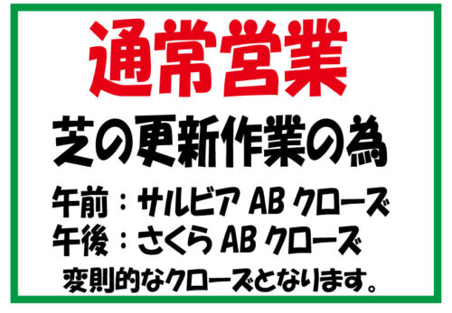4月7日(火) 通常営業 ※芝更新作業の為 午前:サルビアコースクローズ/午後:さくらコー…