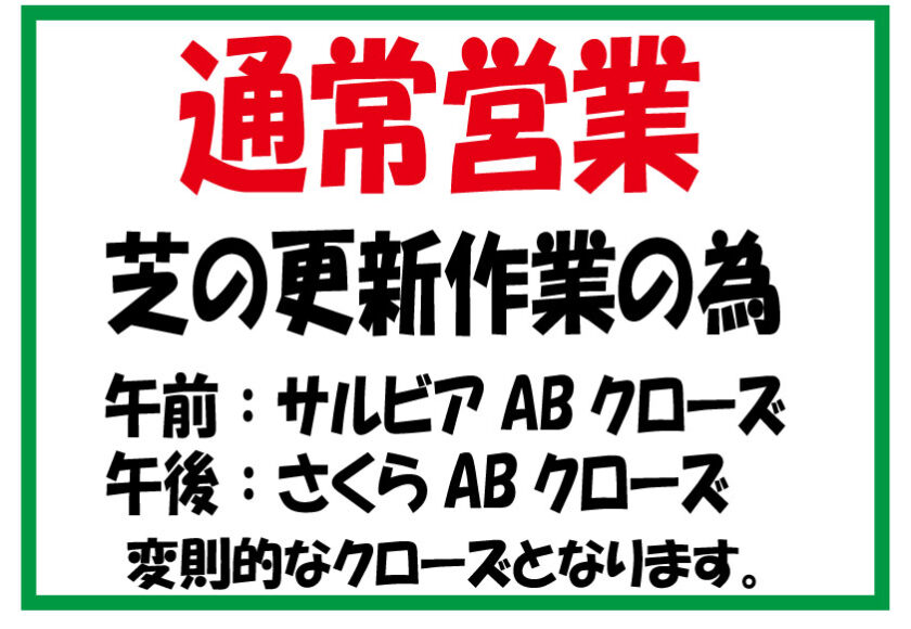 4月7日(火) 通常営業 ※芝更新作業の為 午前:サルビアコースクローズ/午後:さくらコースクローズ